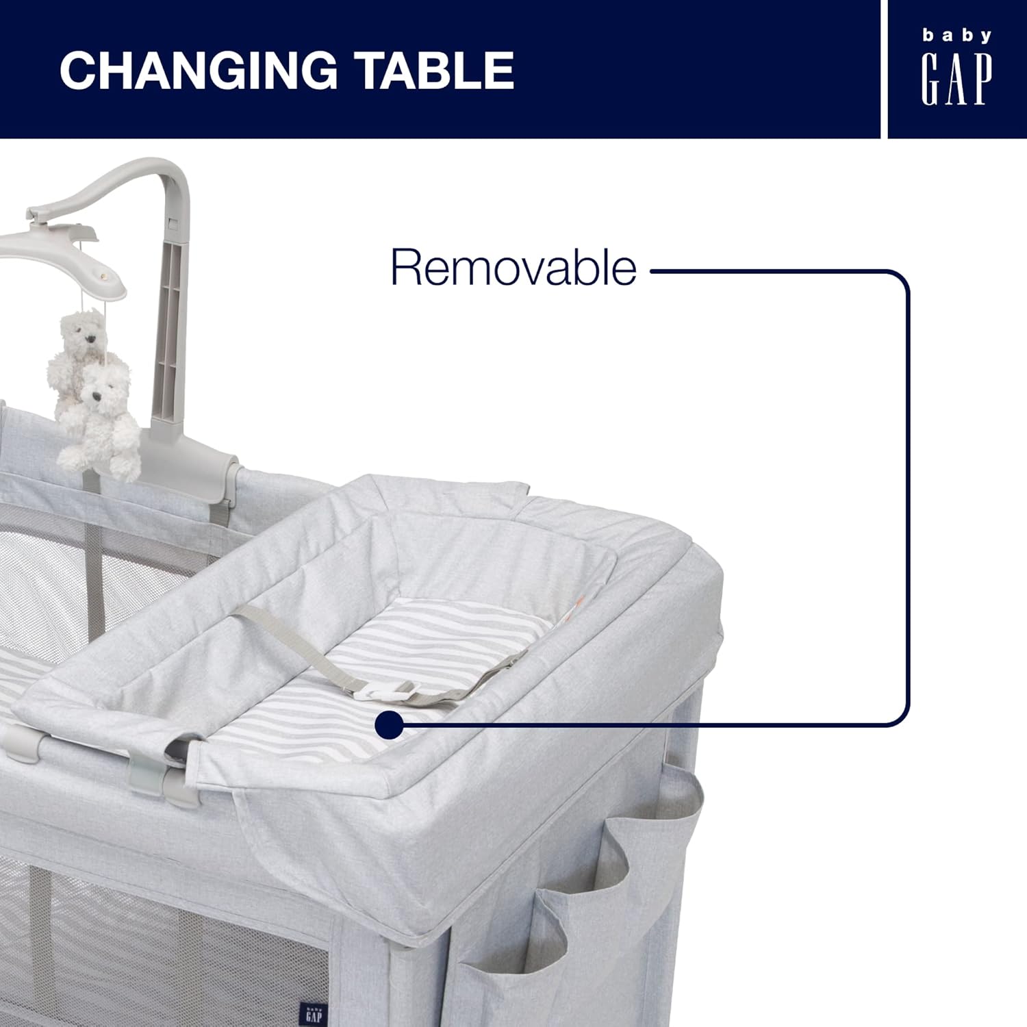 The babyGap Deluxe Play Yard Stripes is a versatile and safe space for your baby to play and rest. It features a removable bassinet for newborn naps, a convenient changing table with storage, and breathable mesh sides for visibility and airflow. Durable and easy to fold, it’s perfect for both home use and travel.