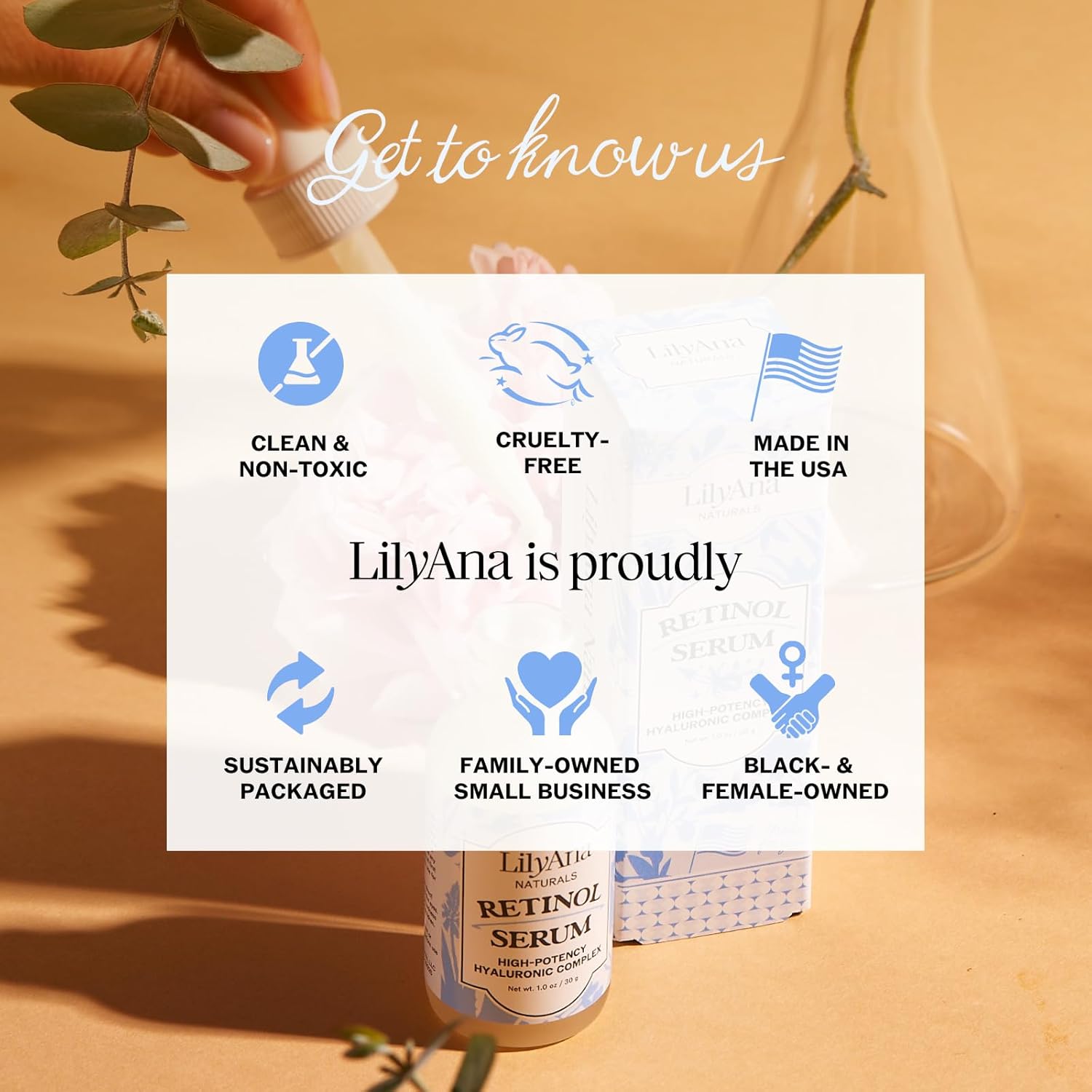 LilyAna Naturals Retinol Serum – Made in USA, Anti Aging Face Serum with Hyaluronic Acid and Vitamin E, Reduces Age Spots and Sun Damage, Promotes Collagen and Elastin (Retinol, 1oz)