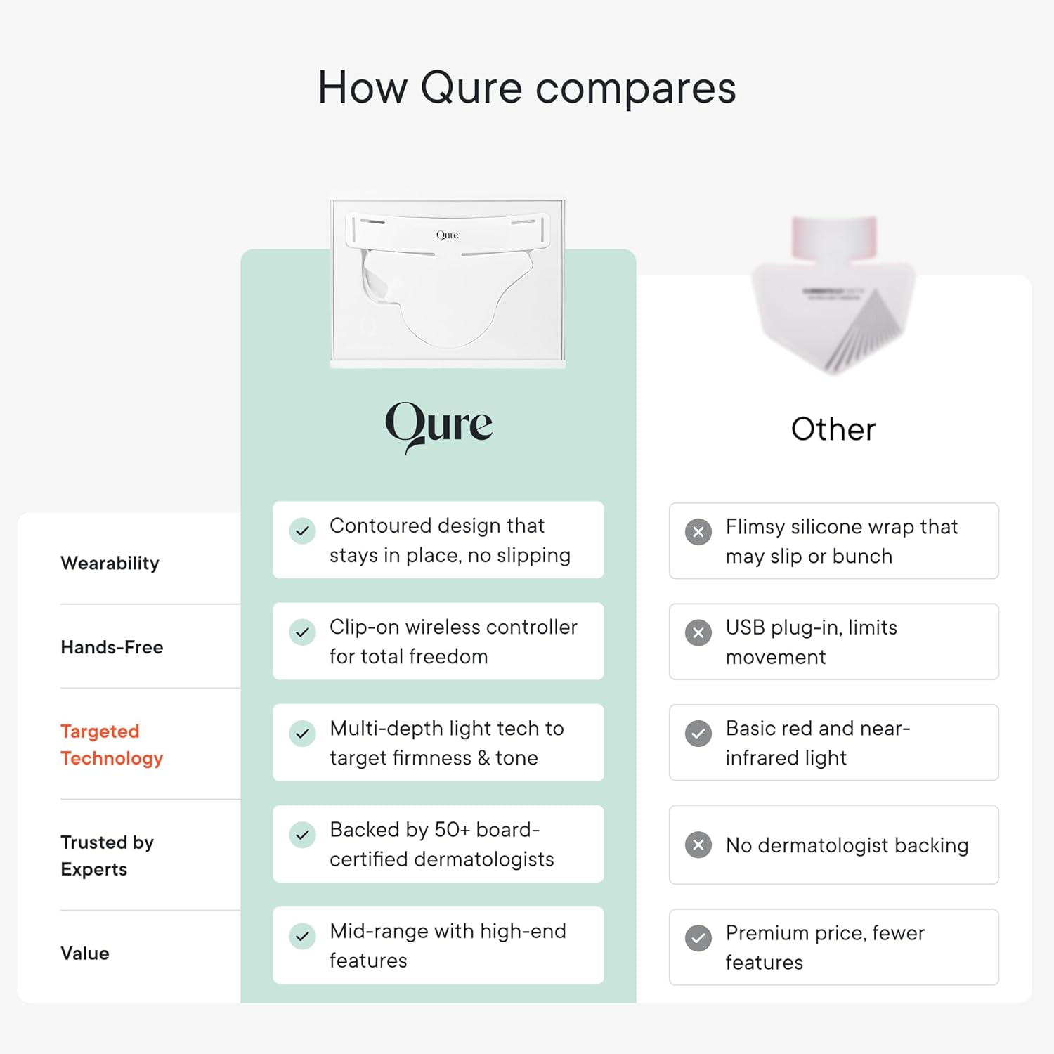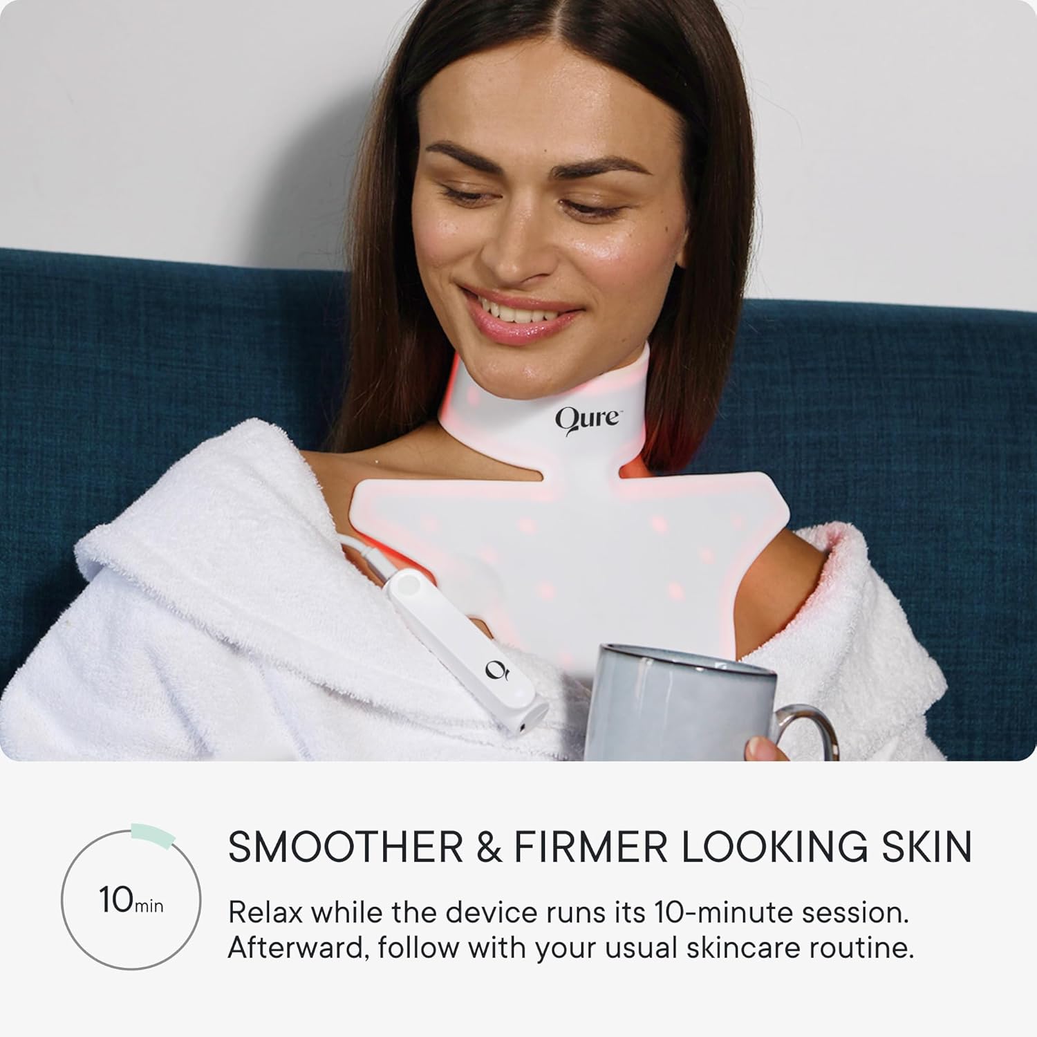 Qure Décolletage Therapy is an advanced LED skincare device designed for at-home use, targeting the neck and chest area. It combines red and near-infrared light to stimulate collagen production, improve skin firmness, reduce fine lines, and enhance overall texture. Safe, non-invasive, and easy to use, it helps promote a smoother, more radiant, and youthful-looking décolletage with consistent use.